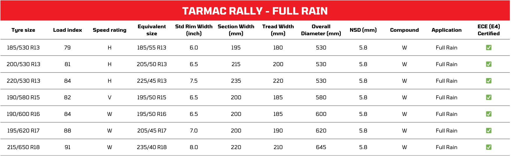 Reifen zugelassen für den Straßenverkehr E4. Geeignet für historische Rallyes und VHC-Rallyes. Erfüllt die N2S-Rallye-Anforderungen.
